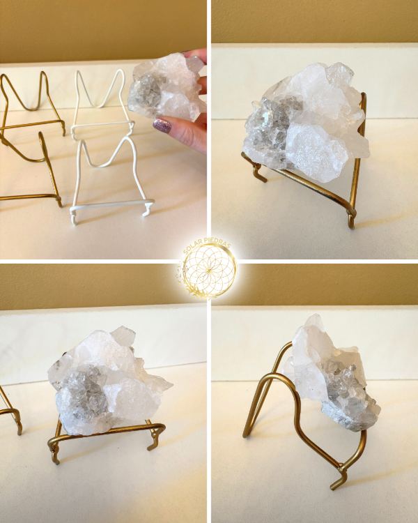 Su diseño proporciona una base sólida y segura, permitiendo exhibir tus piezas de manera óptima, ya sea en hogares, vitrinas, locales, ferias o eventos especiales. La estructura del soporte facilita el acceso y la visualización de cada mineral, asegurando que cada detalle brille y atraiga la atención.